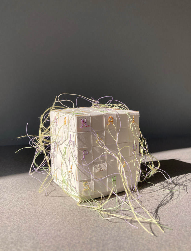 The 12 colors are crafted using an innovative technique, where the act of drawing is translated into a new textile technique based on the capabilities and limitations of a sewing machine. By intentionally using three threads, I create a nuanced color palette, where subtle interplay between colors adds depth and character to the textile.